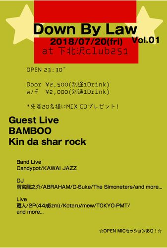 もう少ししたら7月20日金曜日の夜に下北沢club251でDown By Lawですね。 時間が経つのは早いもので、もう後数日です。 ゲストライブにBAMBOOさん、Kin da shar rockさんをお招きしての開催。 PunkサイドからCandypot、JazzサイドからKAWAI JAZZをお招きして…